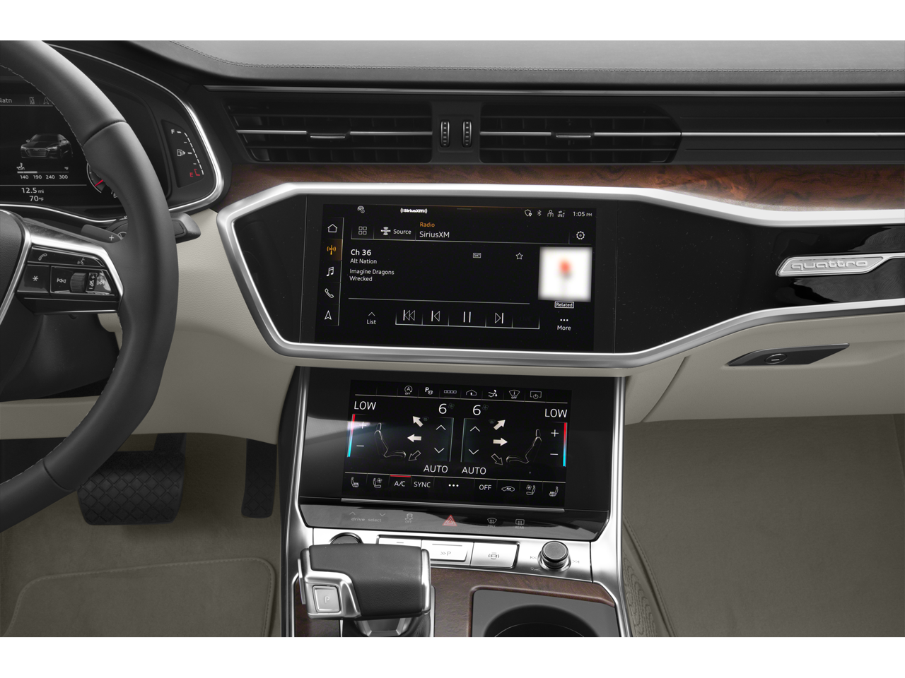 - Radio: Audi MMI Navigation Plus -inc: MMI touch response (10.1" upper screen), Audi connect CARE (limited time subscription), Audi connect PLUS (6-month trial subscription, acceptance of terms required), Audi smartphone interface (wireless Apple CarPlay and Android Auto), Audi sound system, Bluetooth® w/audio streaming and SiriusXM w/360L (3 month trial subscription, acceptance of terms required)