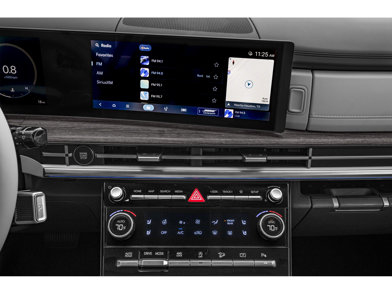 - Radio: AM/FM/HD Bose Premium Audio System -inc: 12 speakers including subwoofer, external amplifier, 12.3" wide touchscreen, Apple CarPlay and Android Auto, Bluetooth® hands-free w/wireless audio streaming, dynamic voice recognition, USB connectivity, SiriusXM, Blue Link connected car system, over-the-air updating capability, navigation system including traffic flow w/incident data via HD Radio (HERE) and rear seat quiet mode